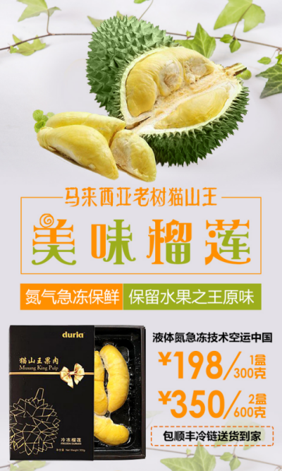 马来西亚猫山王速冻榴莲真正的马来西亚老树猫山王果肉,氮气速冻,300克/盒