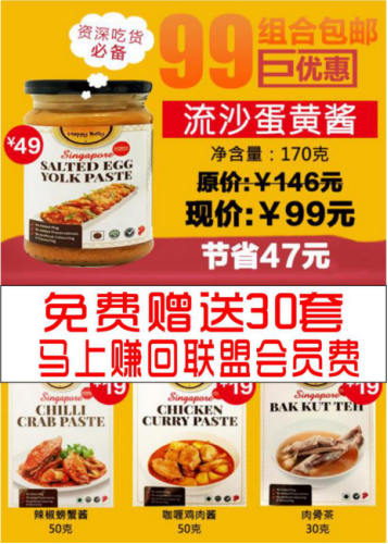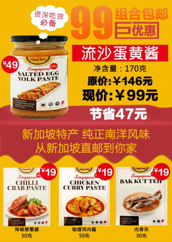 涌泉食品希望进入中国市场,其市场策略却是很新颖很创新,从在新加坡的中国人中开始推广,一罐HAPPY BELLY咸蛋黄膏加上三款HAPPY BELLY浓缩酱料,一共只卖99元人民币: