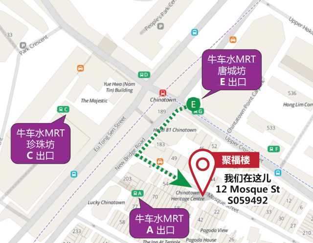 牛车水E出口过马路,2分钟就到哦~