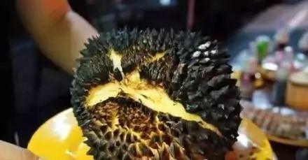 “丧心病狂”地将整只榴莲放在火上爆烤,直到烤到炸裂开口,浓郁的香味飘散出来,里面的果肉烤的特别软,还得拿勺子才能吃~~