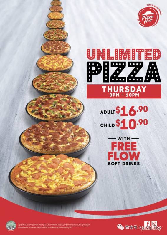 每个星期四,成人只需付$16.90、儿童付$10.90,即可享用无限量披萨和饮料!