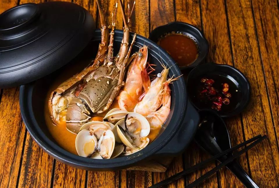 (大虾海鲜火锅了解一下,在精心熬制的美味虾汤里涮着虾肉)