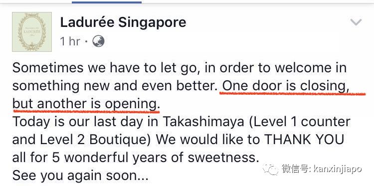 推文中说了,“当一扇门关闭的时候,另一扇会打开”~最后还有“很快就会再见面了”,所以,我们可以推测LADURÉE并不是要离开新加坡……