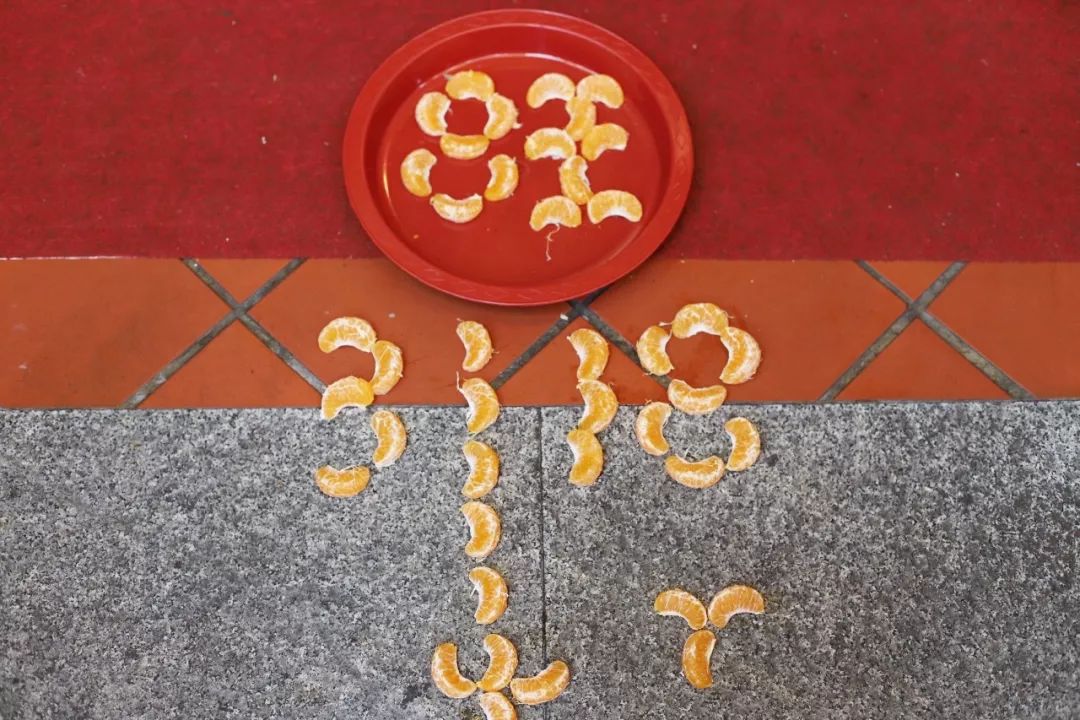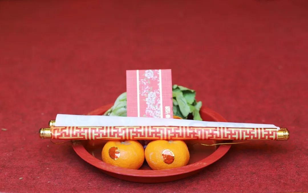 摆盘也很有讲究,里面放了一幅写着“兴旺发”的字画,摆上两个桔子,寓意“吉祥”,后面是生菜,寓意“生财”,中间那个都看得出来,是一个大红包,至于有没有钱,那就不知道了。