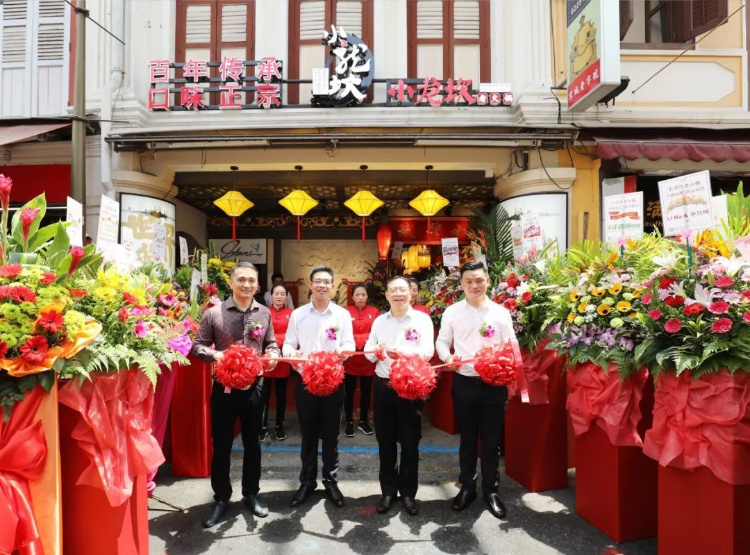 从左至右:小龙坎餐饮管理有限公司新加坡分公司总经理刘阳荷、中国驻新加坡大使馆参赞兼总领事王家荣先生、新加坡天府会杜志强会长、成都小龙坎餐饮管理有限公司执行董事/副总经理夏林肖