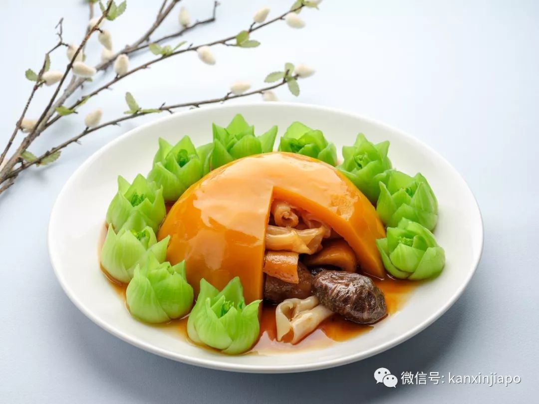 师傅别出心裁,用南瓜做成金色圆顶,周围以碧绿的“花儿”点缀,其实是用上海青的茎雕刻而成。切开圆顶里面大有乾坤,海参、花胶和冬菇有如宝盒里的各种宝物,让人惊喜连连。四川豆花饭庄Beach Road分店独家推出。