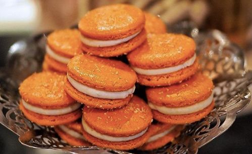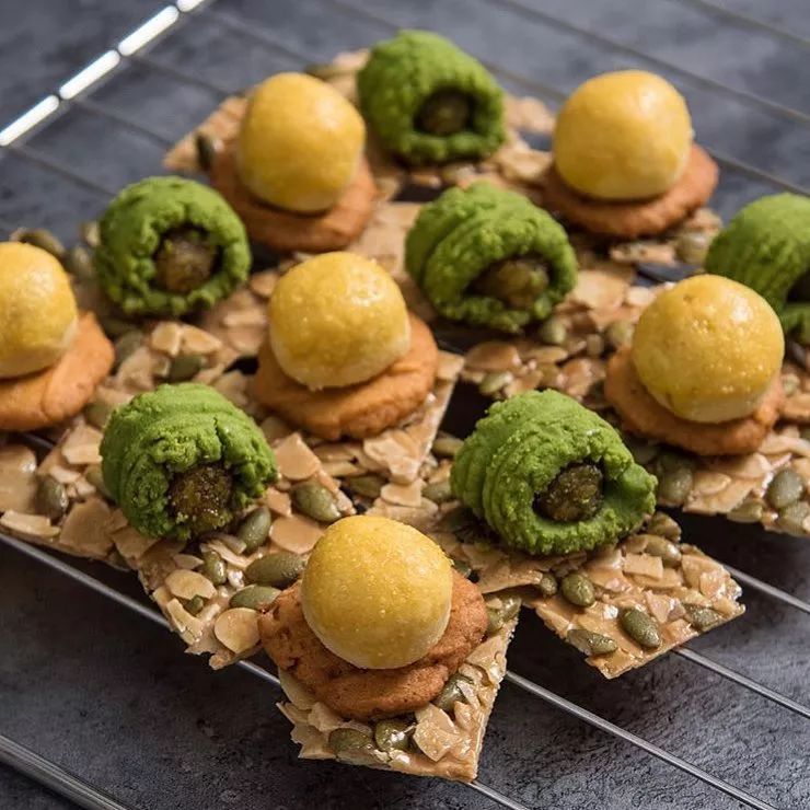 用椰子制成的杏仁马卡龙外壳,夹着蜜饯南瓜,炸青葱和椰子山药奶油。