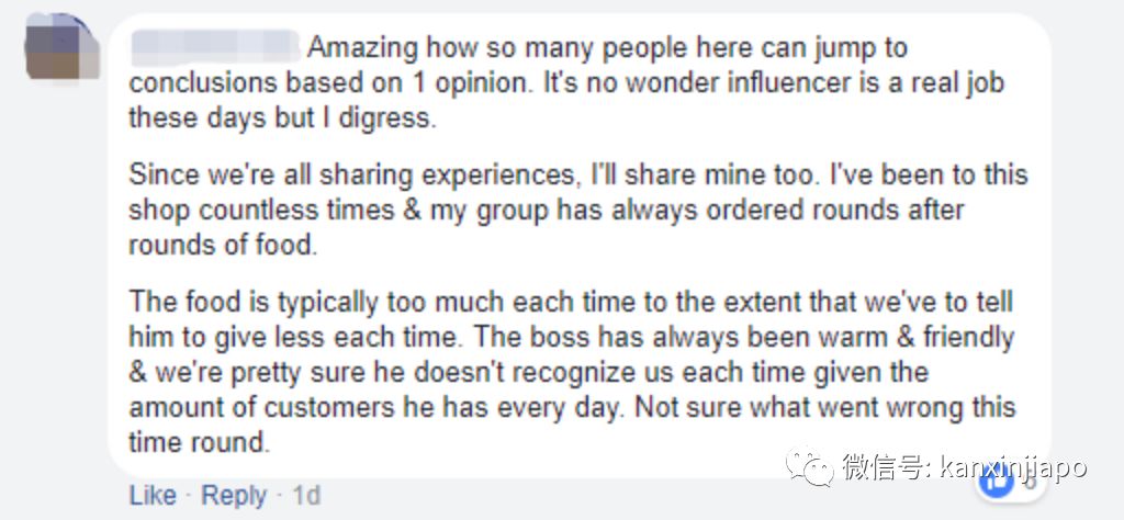 居然这么多人因为一个看法就贸然下定论,既然大家都在分享自己经历,那我也分享下我的经历。我去过这家店无数次,每次去都点了好几轮食物。他们给的食物多到我们得叫他少给点的程度。老板人很亲切友好,我敢肯定他并不认识我们,因为他每天那么多顾客。不知道这次为什么会这样。