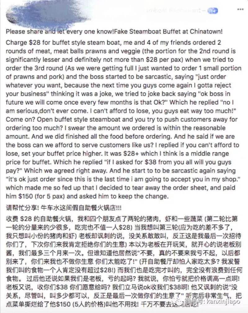 他和另外几个朋友到牛车水一家火锅店吃自助餐,点了两轮的猪肉,肉丸,虾和蔬菜,食物一轮比一轮少,准备叫第三轮时,竟遭到“讽刺”,老板叫他们以后别来了,太亏了!