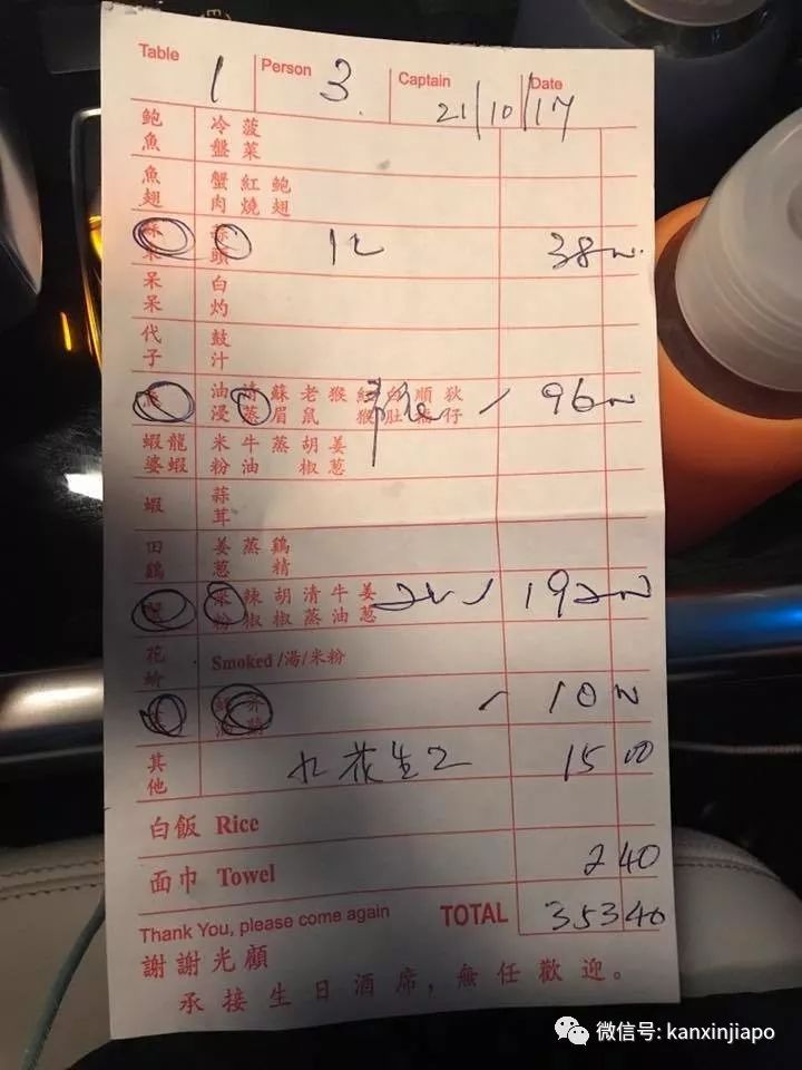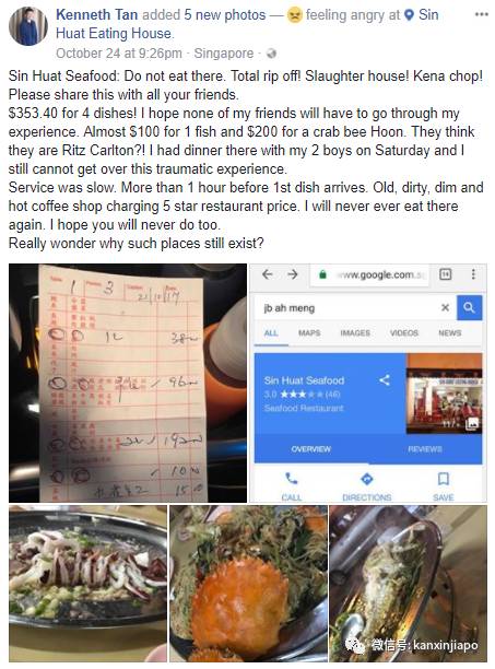 最近一位新加坡陈姓网友,就在个人Facebook上晒了一份用餐账单,他和两个儿子在一个星期六到位于芽笼的“新发海鲜(Sin Huat Seafood)”餐馆用餐,只点了包括螃蟹米粉在内的四个家常菜,所有费用加在一起,居然要353.40新元(将近1800人民币)。