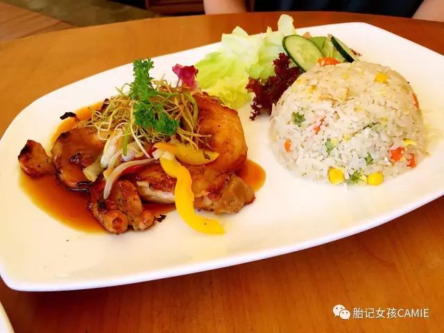 不想吃西餐的,可以点这道看起来是中餐,名字却很日式的Teriyaki Chicken 煎鸡肉配炒饭,是这四道主食里最便宜且管饱的 ▽