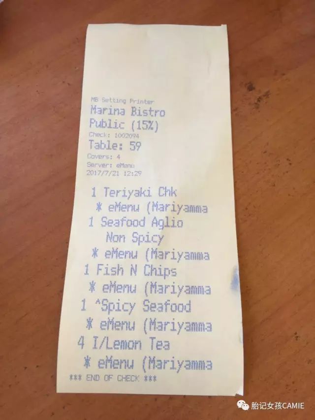 最后,晒下账单,四个人吃下来一百多,CAMIE个人评价:价格不便宜,味道一般,主要看海景,内什么,路途有点遥远,哈哈哈。▽