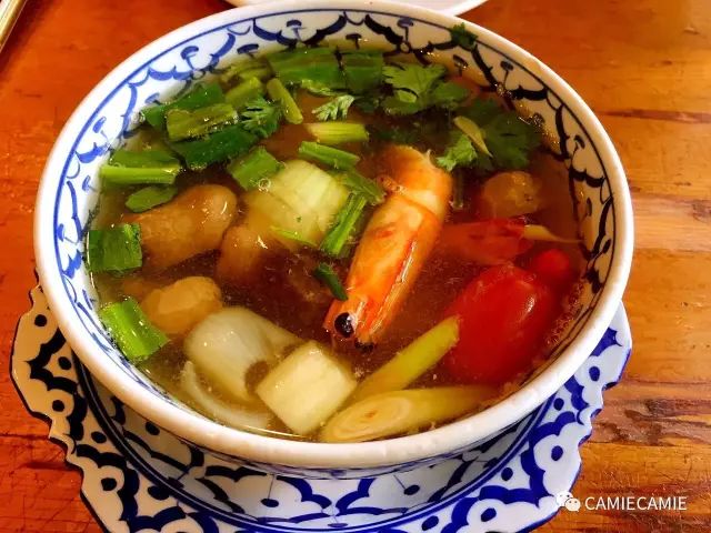 依个人口味,有加椰奶和不加椰奶即清汤可选,价格一样。我们选了清汤。冬阴功汤地道正宗,仿佛置身泰国。不过番茄用的是整颗小番茄,也就是圣女果,让我感到有点意外。