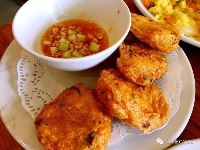 鱼饼和在超市看到的完全不一样,虽然不清楚里面具体混合了什么,但我可以确定加入了天然的香料。泰国菜健康的秘诀在于此,不加调味料如盐酱油味精,而是改用各种天然香料,如泰国冬阴功汤里的香茅和南姜,以及这道鱼饼里面的香料。至于想知道混合了什么香料,你可以问问服务员哦。