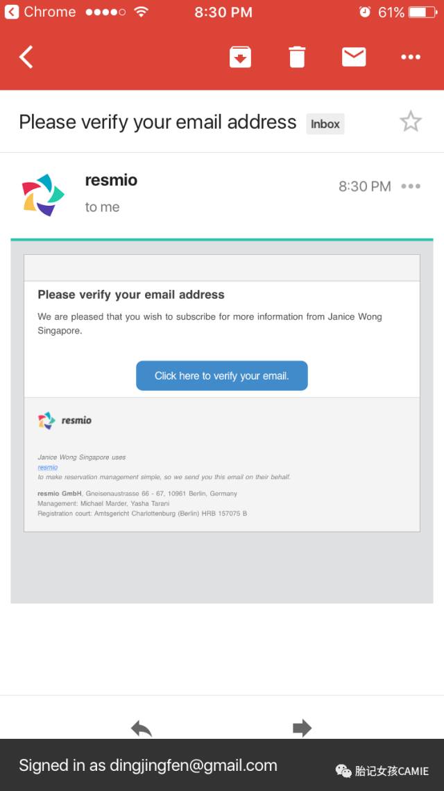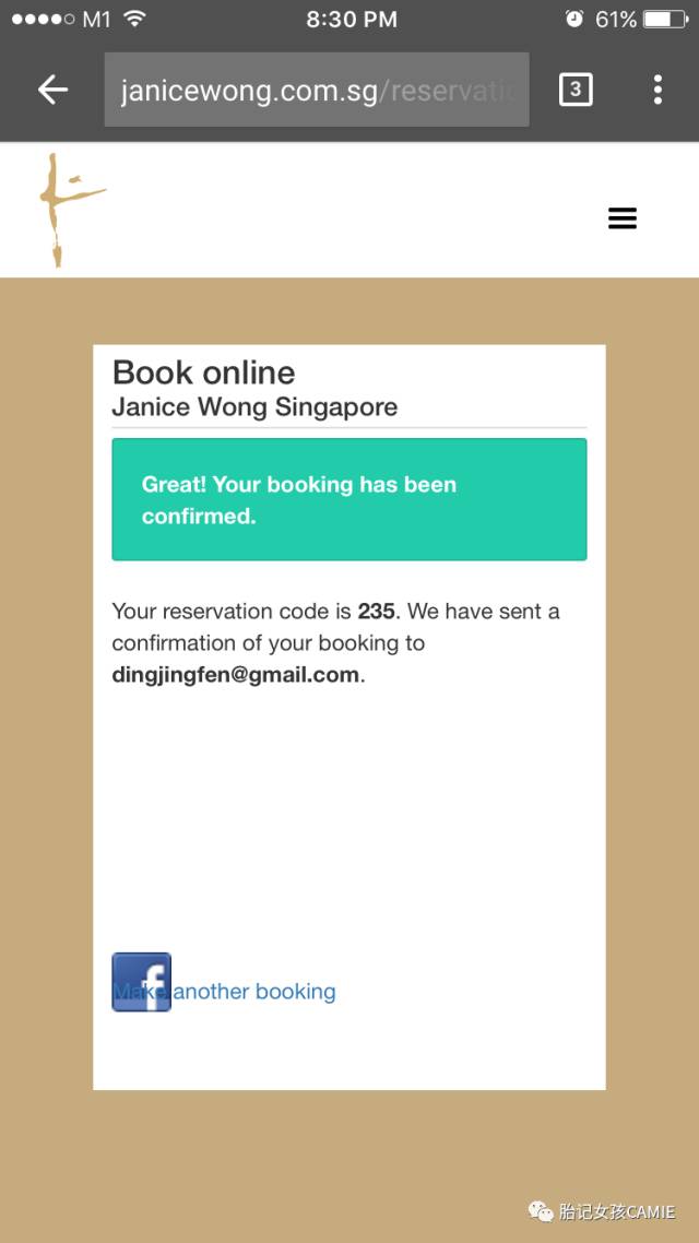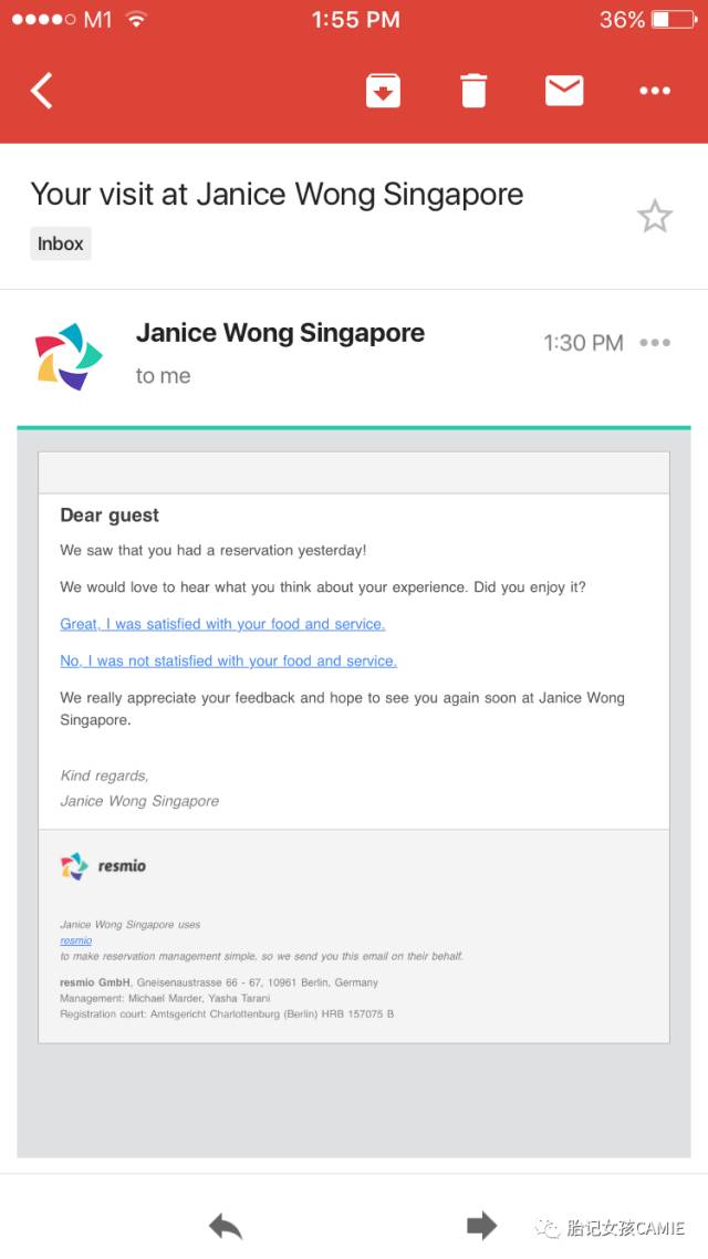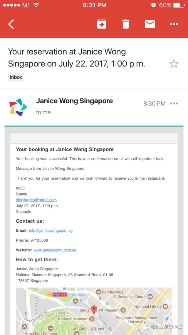 等到预约日期的前一天,Janice Wong 还会贴心地再次发送邮件提醒你明天有预约,告诉你联系人的电话邮箱以及路线,真是太有心。▽