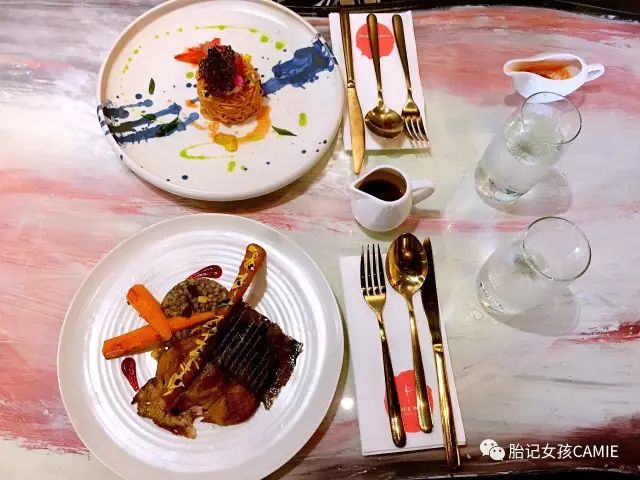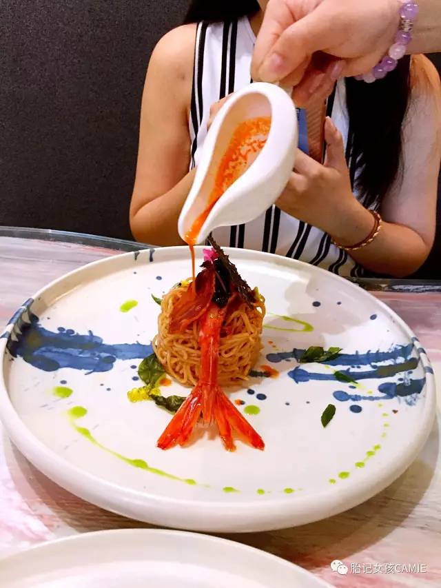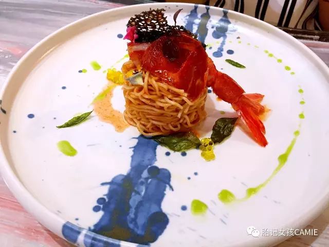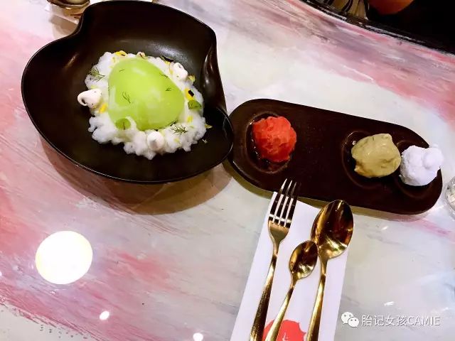 散落在盘子上的一圈是青豆汁,上面黑色的是鱼子酱。看来不是虾贵,是酱贵啊!▽