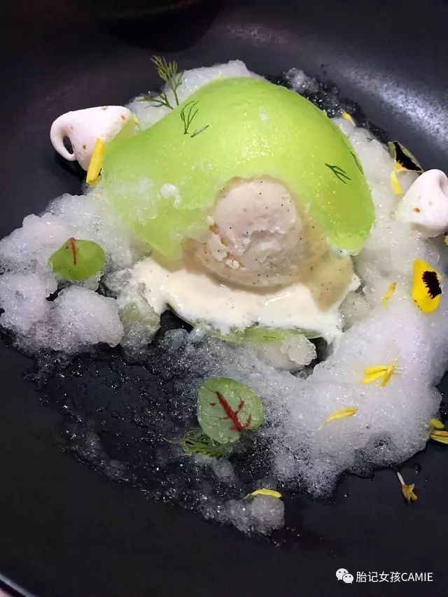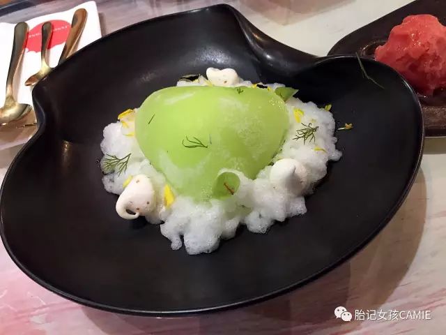 果然是绿油油一片,绿色的是果冻,口感Q弹,里面藏了一个冰淇淋,甜品在嘴巴里跳舞说的就是Janice Wong的甜品啊。▽