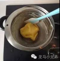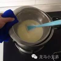 5.水烧开,将混合好后的糊隔水边搅拌。火可以开中小火,打蛋盆这时温度有些高小心被烫伤,可用湿水布包裹住打蛋盆,刮刀要不停的搅拌,以免大片结块。
