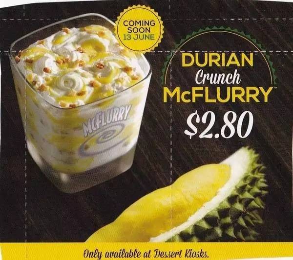 在2013年,新加坡的麦当劳也是推出过“Durian Crunch”版本的麦旋风的,但当时也是限量发售,而且也并不是D24榴莲,只是用了榴莲糖浆制作~~