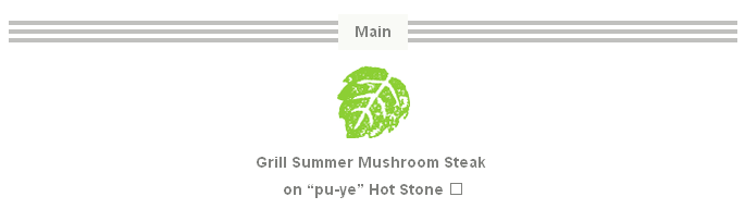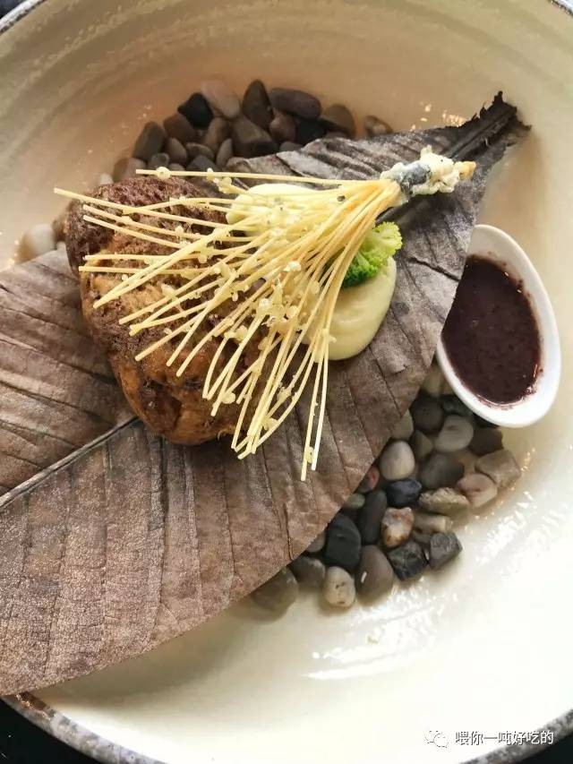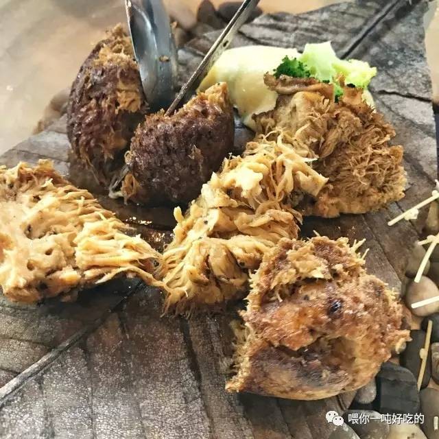 热石烤猴头菇在蒲叶上,看起来有没有很像热石烤牛排。猴头菇有蒲叶的清香。