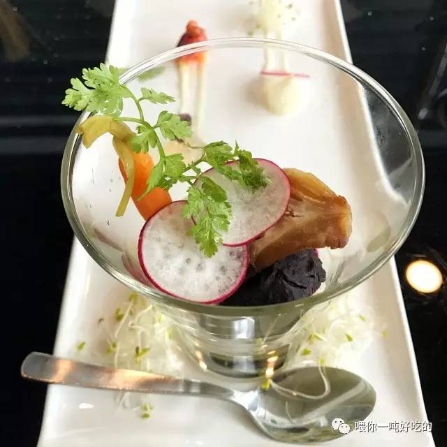 这是一道颜值很高,但味道很普通的菜。根茎类的蔬菜搭配上有着淡淡松露的土豆泥。