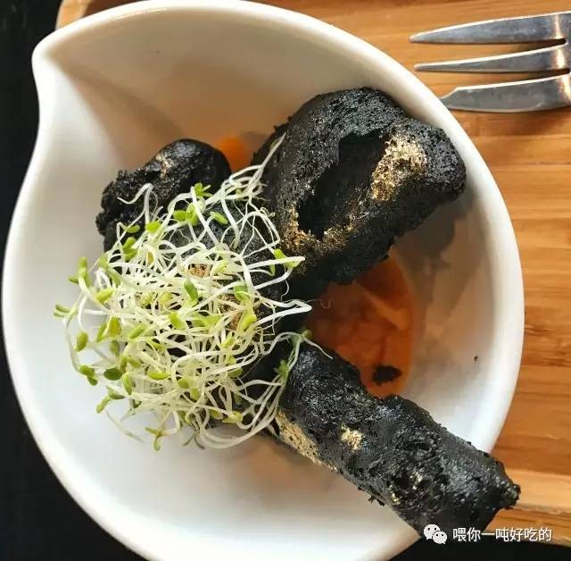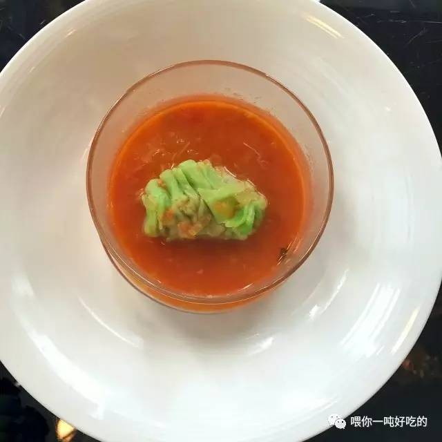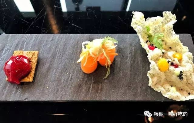 服务员会贴心的告诉你,食用这道开胃菜的顺序。记得先从中间那个很像三文鱼寿司开始,至于这个寿司是用什么做的,带着好奇来吃吃看哟,其实是用胡萝卜先做成果冻装然后制成寿司的样子。