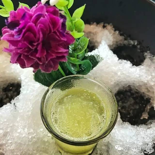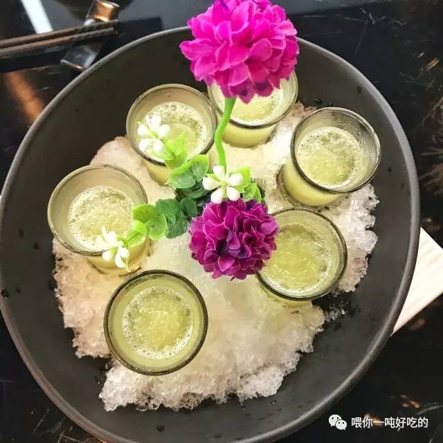 免费的开胃小饮整齐的摆放在带冰的托盘上。尝起来里面有一些小碎冰,酸酸甜甜冰冰凉凉,非常的开胃。