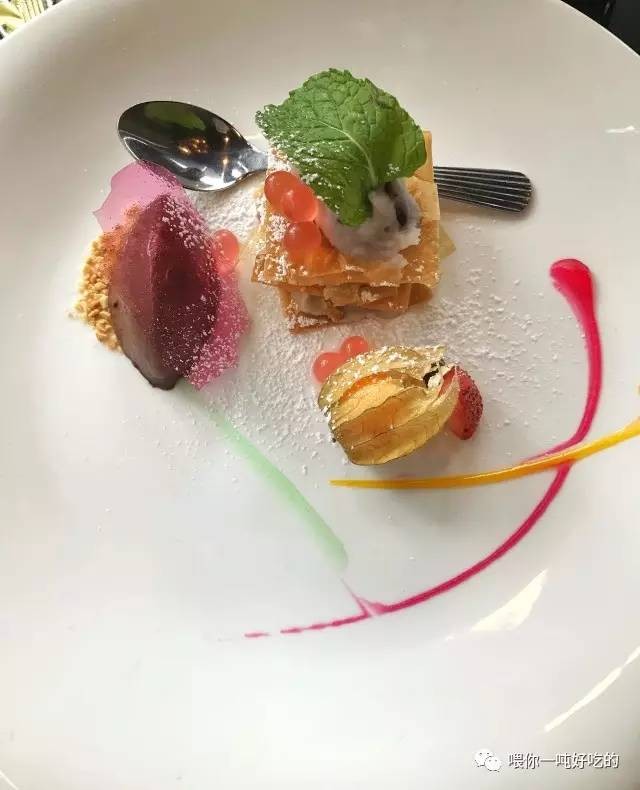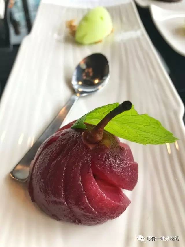 宛如一朵含苞待放的花,其实是一个用红酒浸泡过的梨子,所以梨子的味道有着酒香味。吃完梨子,吃点青柠味道的苏打冰激凌,酸酸甜甜,清清爽爽,有夏天的感觉。