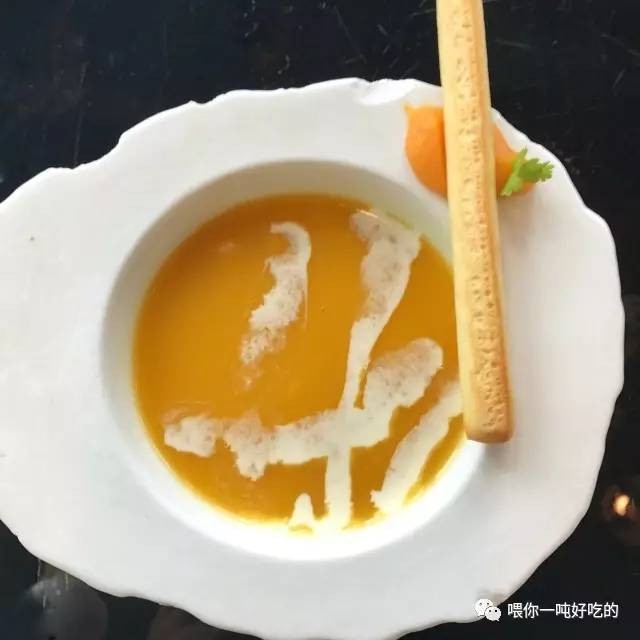 南瓜汤配上意大利 Ciabatta面包,南瓜味道很浓厚,盛放在很讨喜的容器里面。