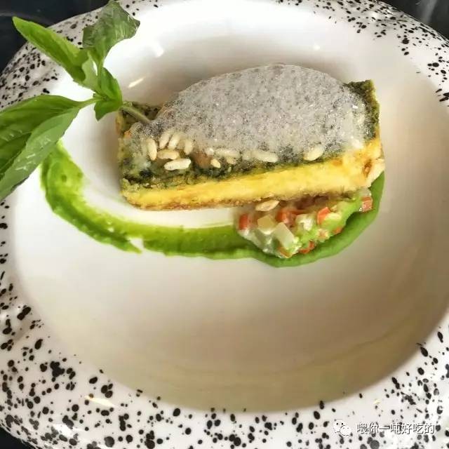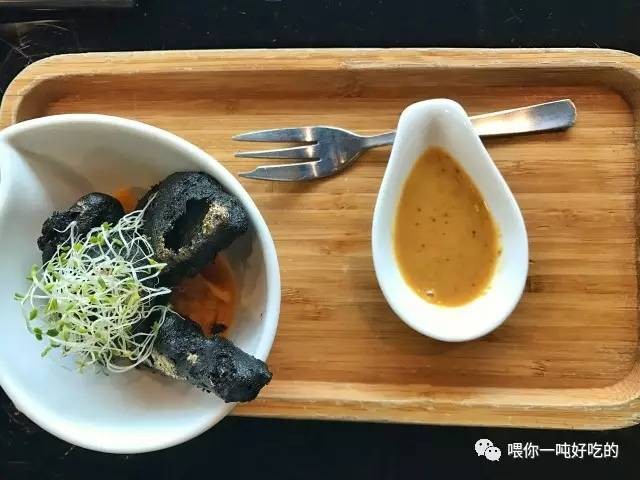 香煎的青柠豆腐,淋上绿咖喱的乳液,一旁搭配着草本植物和蔬菜的饭。这道很特别的地方是豆腐上面的那层泡沫是有咖喱味道的,端上来的时候记得先尝尝看。