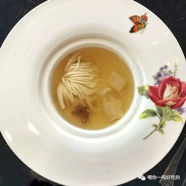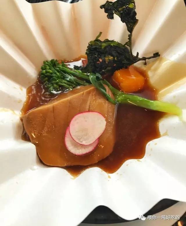 这道简直就像一盘艺术品,日式昆布肉汤里面是绽放着的豆腐手工雕花。汤里的豆腐花斑丝丝分明,与盘子上的彩色花朵相呼应。汤很清淡,但看着么这么精致的汤,真不忍心下勺子破坏。第一次来这家餐厅一定一定要点来这道~