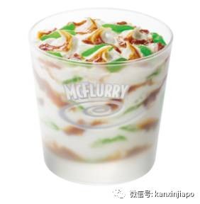 除了主食汉堡,麦当劳则推出了珍多口味的冰炫风(McFlurry),在普通的香草冰淇淋里,加上了绿色的珍多冰果冻和椰糖酱。