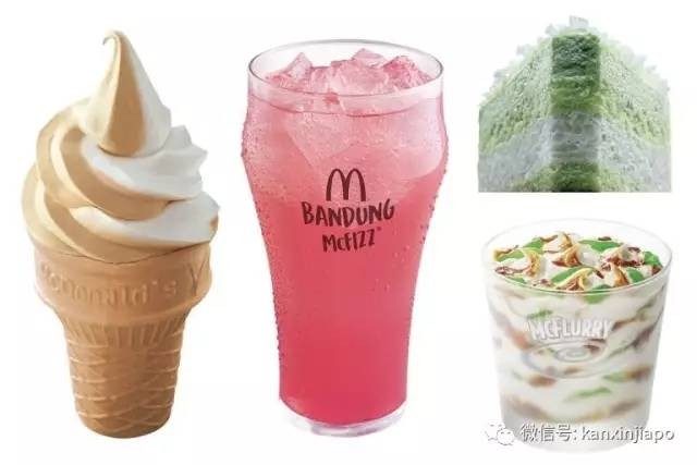 而且,甜筒也会有珍多冰口味哦!甜品的选项特别多,除了冰淇淋,还有椰子派班兰糯米糕,饮品方面,则有玫瑰奶露(Bandung)口味的McFizz,以及椰子班兰口味的星冰乐,选项那叫一个丰富!