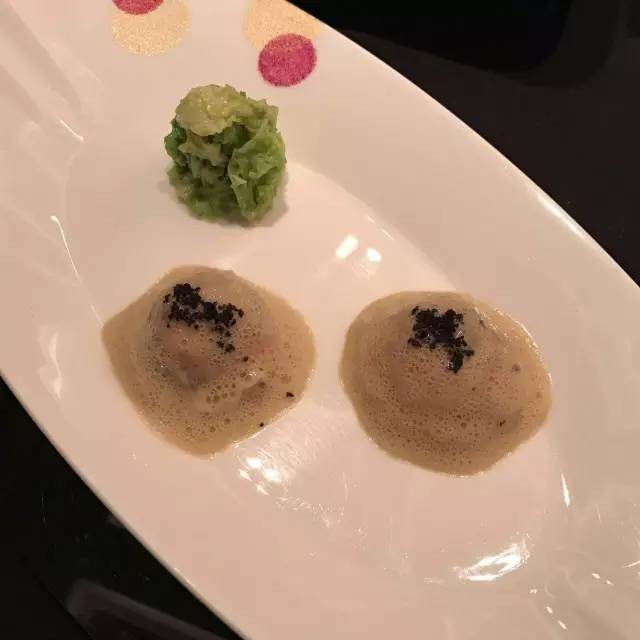 主菜第一道,意大利面云吞,里面包了一只虾,上面黑色的点缀是黑松露,配了包菜。口感很Q弹,味道鲜美。