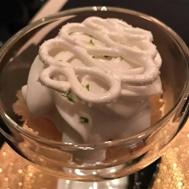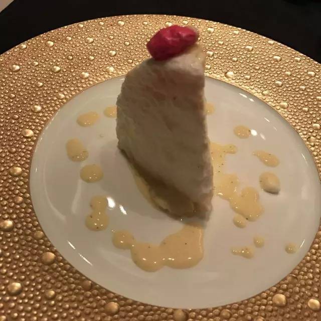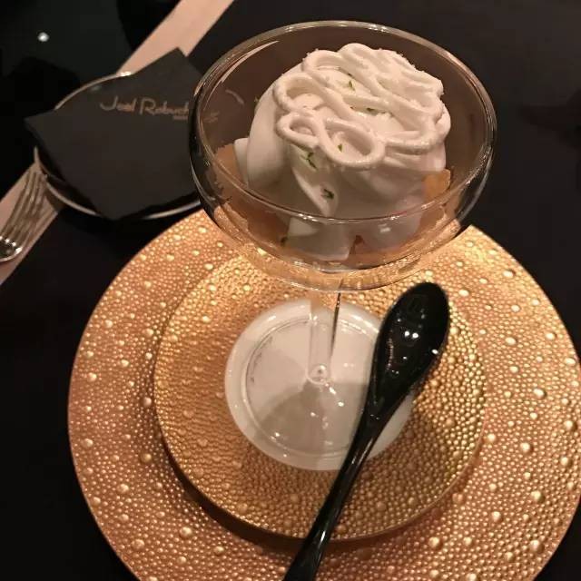 我选了这个,这道甜点口感像泡沫,很轻,完全不会有饱腹感,女士们可以放心大胆地吃下。在法国这道甜点叫做飘浮的冰山,因为它很轻,外形又是白色的可以飘浮在水面上,所以在法国这道甜点是装在一个碗里,下面是牛奶上面飘浮着一块甜点,是很有意思的一个甜品。