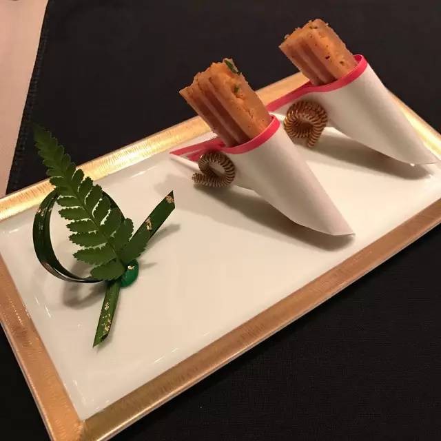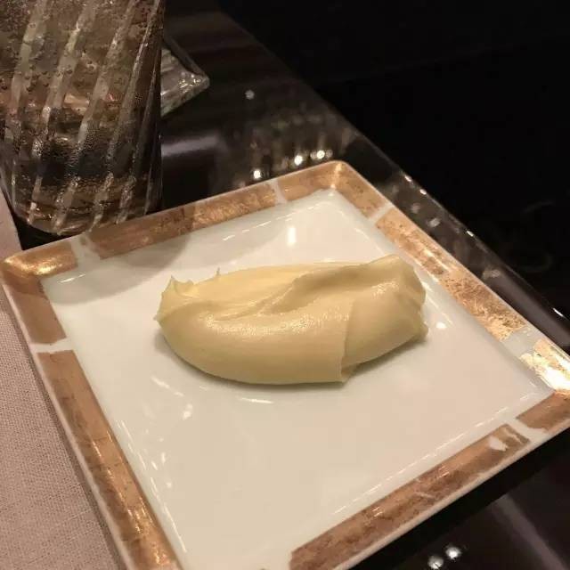 ▲这是主厨送的餐前点心,里面是夹有蟹黄的小饼干,一口下去酥脆可口,非常鲜美。每个套餐主厨都会送餐前点心哦。