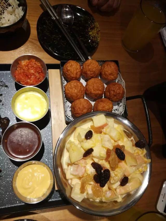 配菜有泡菜、鱼丸、沙拉、羊排、薯条,简直不要太丰盛啦!沙拉里面的葡萄干吃起来特别甜呢~