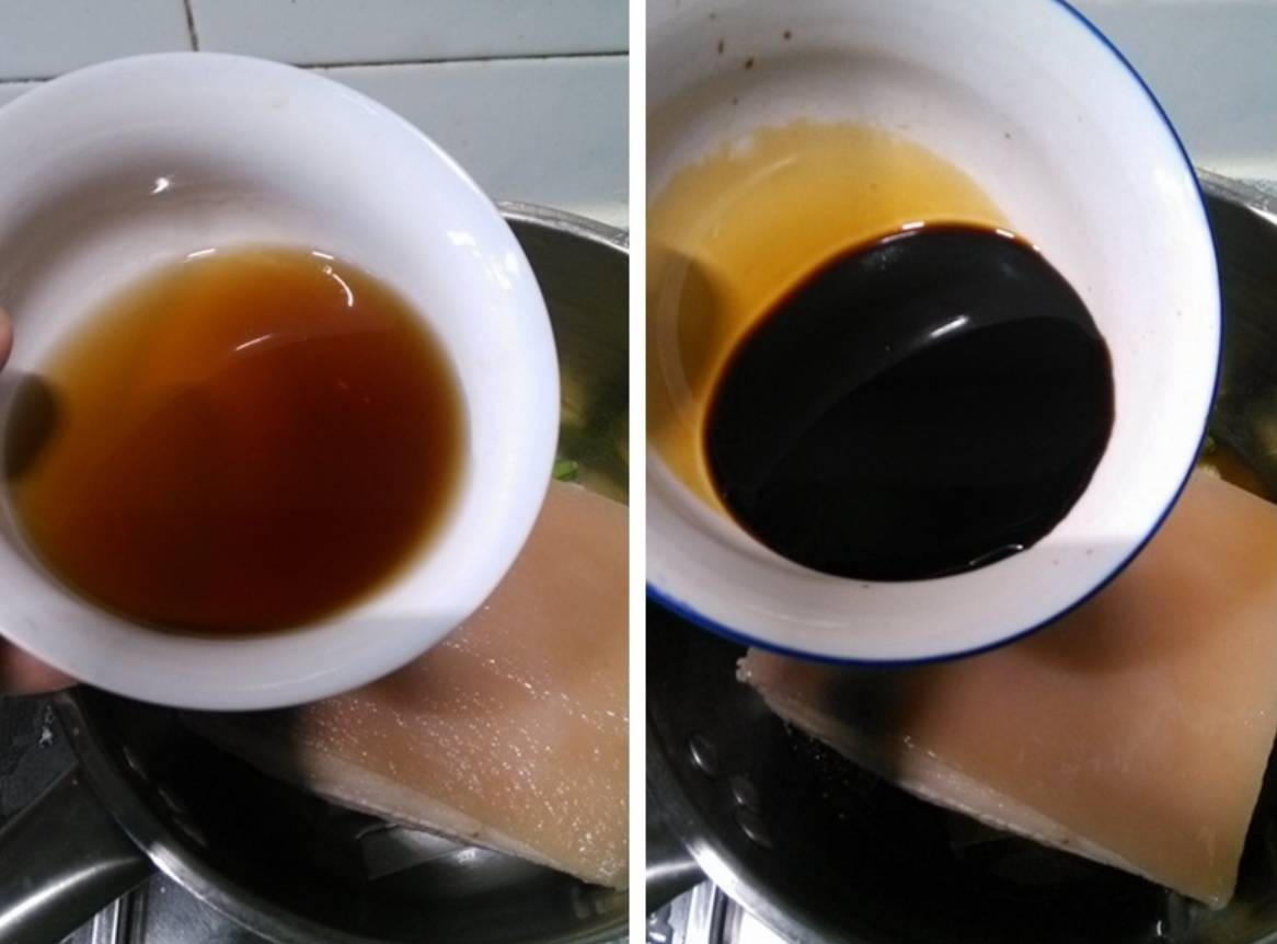 6、加入150g酱油,生抽即可(我晚上拍的,看着有点像老抽);