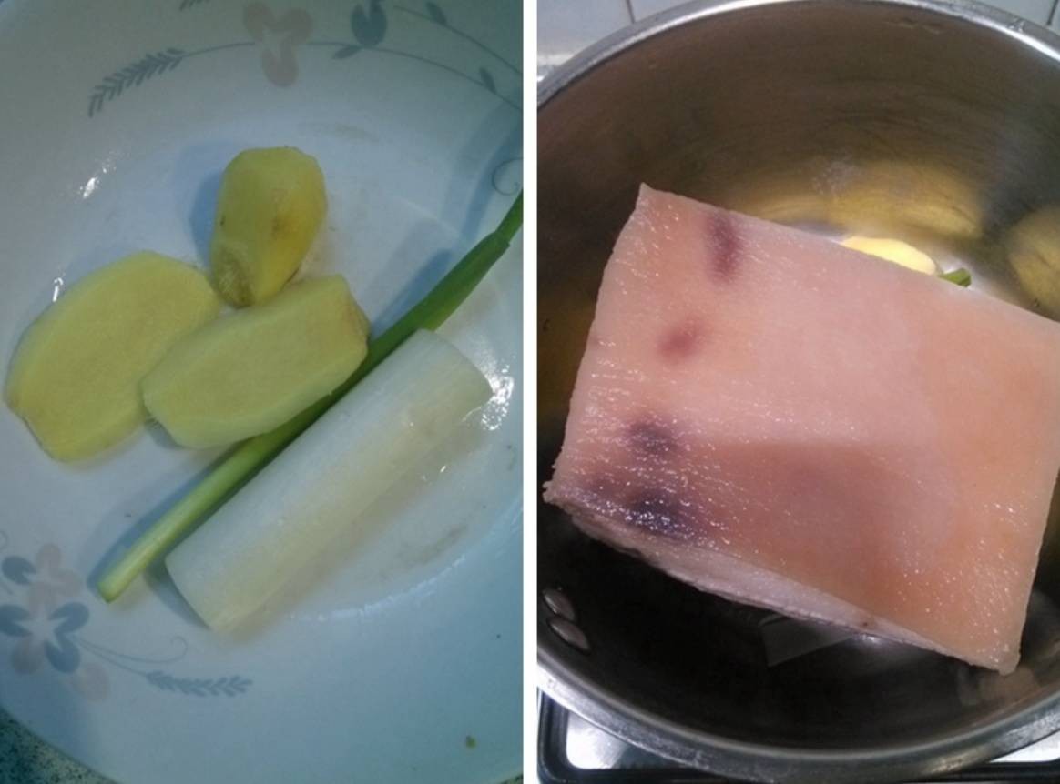 4、用一个小锅,先放好葱姜,五花肉放在上面,皮朝上;