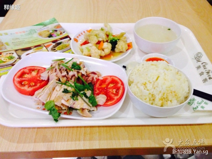 挺适合一个人休闲下午吃个饭,属于典型的便餐。给人有种回到新加坡巴刹一个人吃饭的感觉,再配上一个托盘这个感觉就更明显了。老板人很客气,是个新加坡人。鸡肉做的非常嫩,配上黄瓜番茄也很爽口。很实惠,一盘鸡,一碗闷饭,一份鸡汤,加上一个自选的素菜,才12元。
