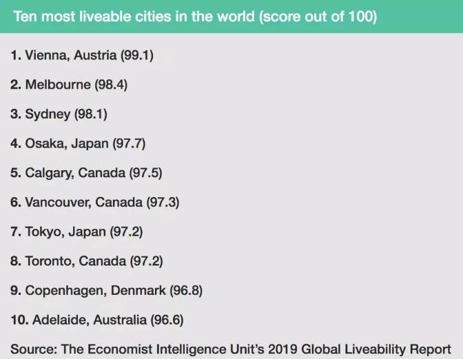 据综合衡量评定,2019全球最宜居城市前10名按顺序为:维也纳、墨尔本、雪梨、大阪、卡尔加里、温哥华、多伦多、东京、哥本哈根和阿德莱德。