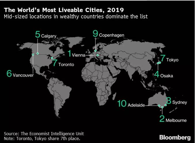 经济学人智库(EIU)公布的2019年全球宜居城市排行榜中,维也纳连续第二年击败墨尔本占据榜首。