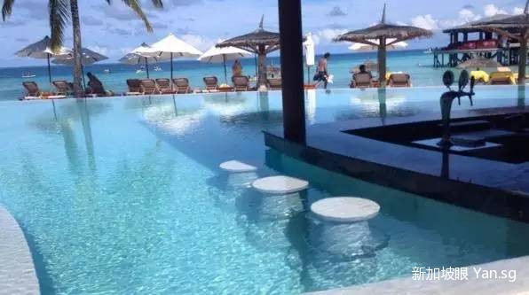 就餐结束,去酒吧VIU 坐坐吧。VIU是岛上最主要的酒吧,很多活动都在里面举行,比如喂鱼,中午下午的糕点,不定时的驻场。VIU的VIEW最好,坐在外圈的沙发上或躺在绳床上能看到最美的景色。三家酒吧的酒水前面画√的都是免费的。