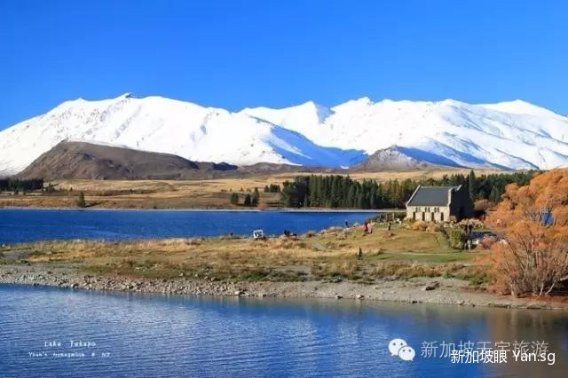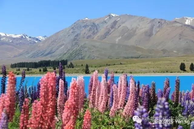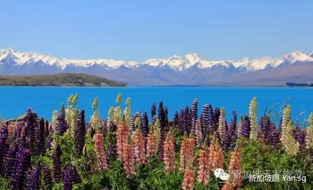 || 白雪皑皑的南阿尔卑斯山,湖边长满了色彩绚丽的鲁冰花,点缀着雪山湖景