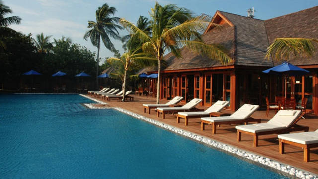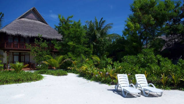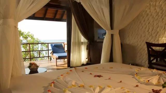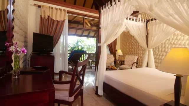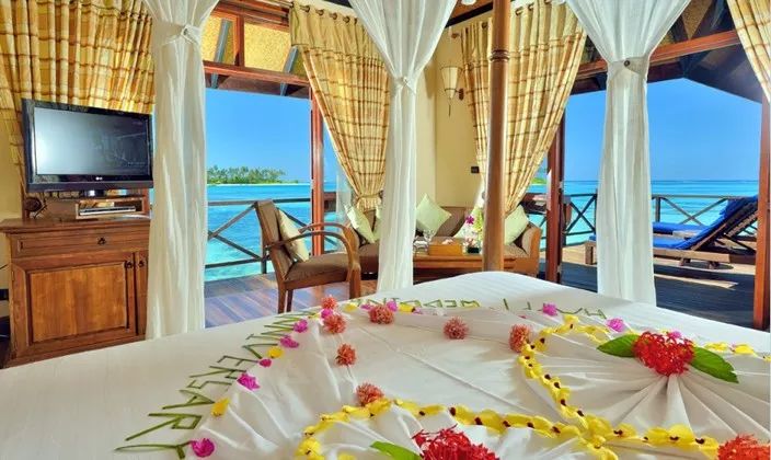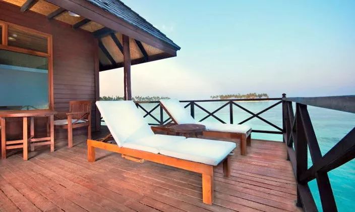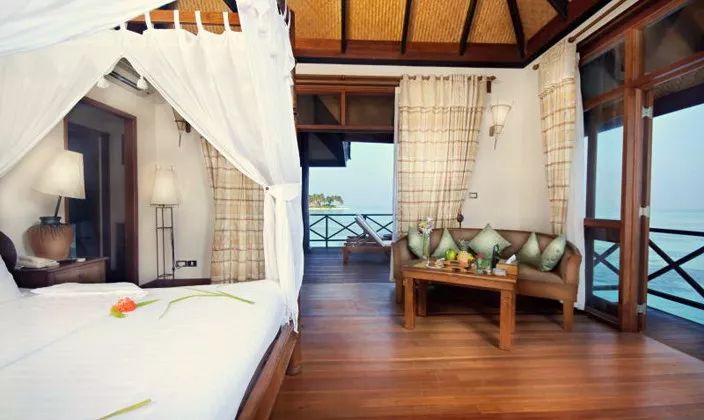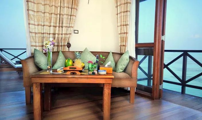 房间设施:屋顶吊扇、冷气空调、小吧台、国际直拨电话、卫星电视、四柱King size大床、柚木家具休憩区、书桌咖啡机、音响(CD player)全套卫浴、浴缸、下身盆(bidet)、吹风机、冷热水、私人日光浴、swim-up平台等; 在精致的家具摆设中,小酒吧,茶/咖啡机,柚木家具的起居室,卫星电视,CD播放机。专用的楼梯进入水里,浮潜观赏珊瑚礁和热带鱼。
