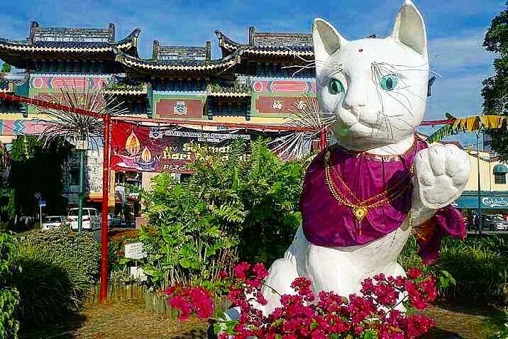 唐人街口的这只憨态可掬的白猫,也是古晋最具代表性的猫咪雕塑之一,人们还会时常为它改变装束,比如圣诞节的时候就会为它穿上圣诞老人服,戴上圣诞帽和铃铛,连装礼物的包包都有乖乖提好。