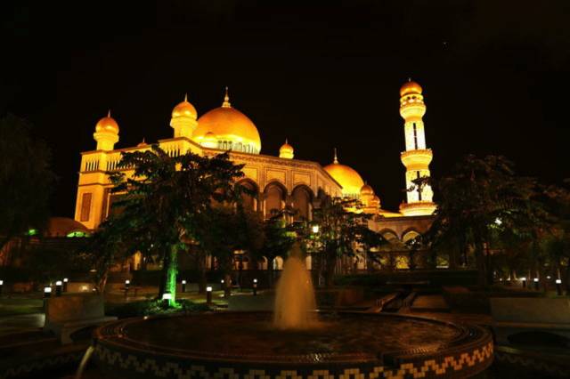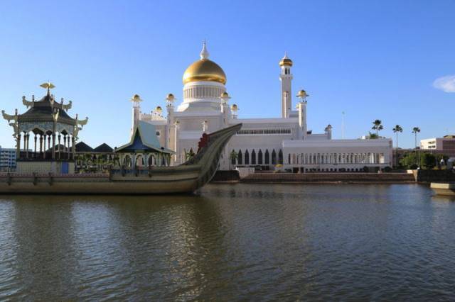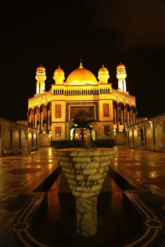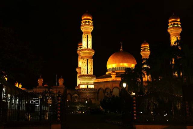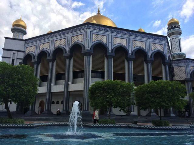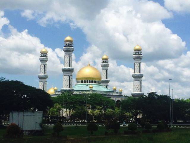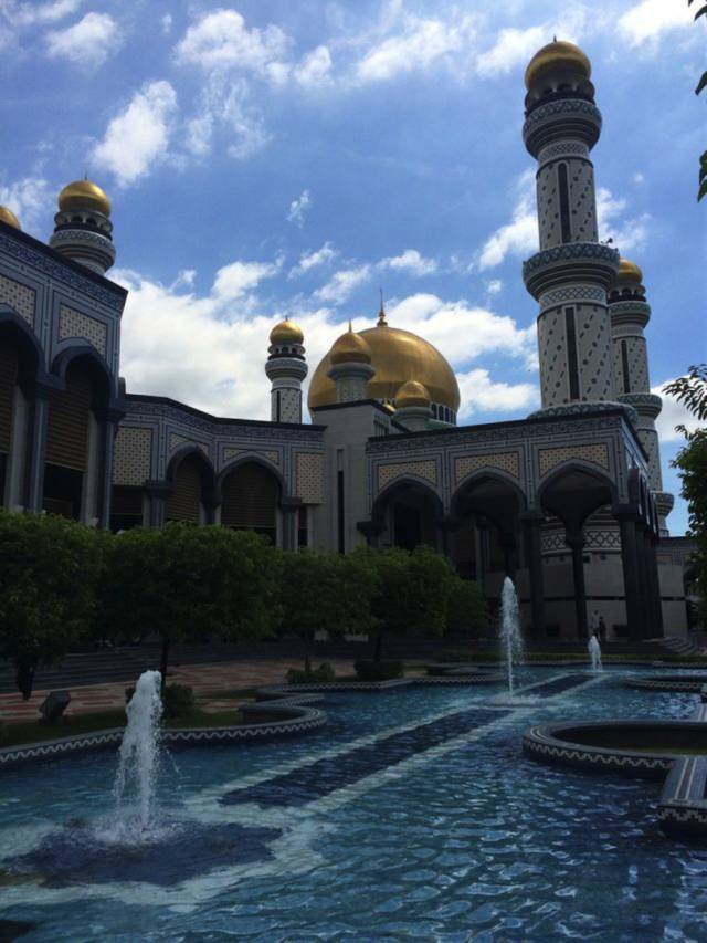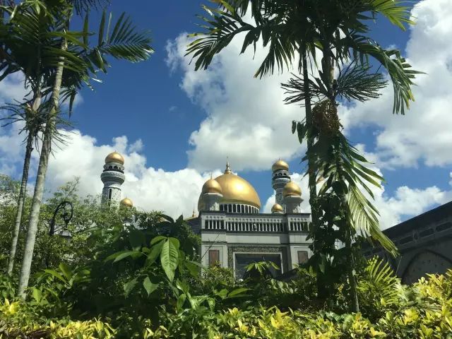 哈桑纳尔•博尔基亚清真寺(Jame Asr Hassanal Bolkiah),也叫蓝清真寺。由主体建筑和尖塔组成,主体拱顶与四周的尖塔均镀24k纯金,远远望去,闪烁着华丽、庄严的金色光辉,也使得整座寺院显得雍容、壮观。这是文莱规模最大的清真寺,也是最早的清真寺,是为了庆祝苏丹登基25周年而建筑的。