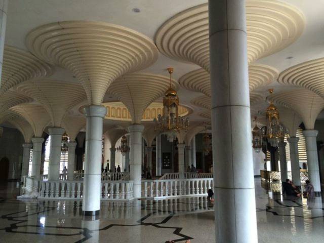 路过奥玛尔·阿里·赛福鼎清真寺(简称白清真寺)。建于1958年,以当时苏丹奥玛尔·阿里·赛福鼎的名字命名,纪念他建国17年来的功绩。清真寺被湖水环绕,湖面平幽如镜,一艘仿文莱古舟的石舫,浮在碧水之中,树木繁盛,构成一幅美丽的天然图景。