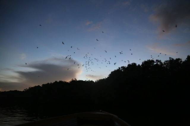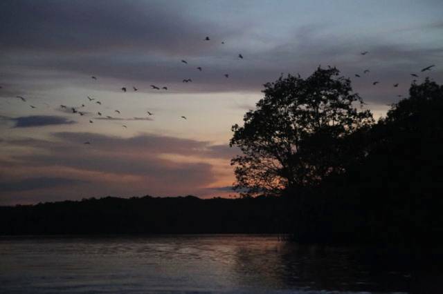 这是森林边上的鸟,我们到森林的时候,天已经黑了。这些鸟也早已经休息,船家用灯光打到树上,鸟就全部飞起来,这种鸟睡觉姿势特别优雅,具体什么鸟,我也不懂。
