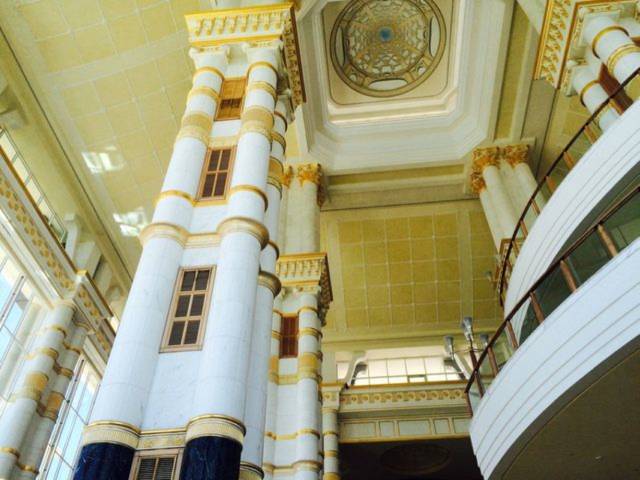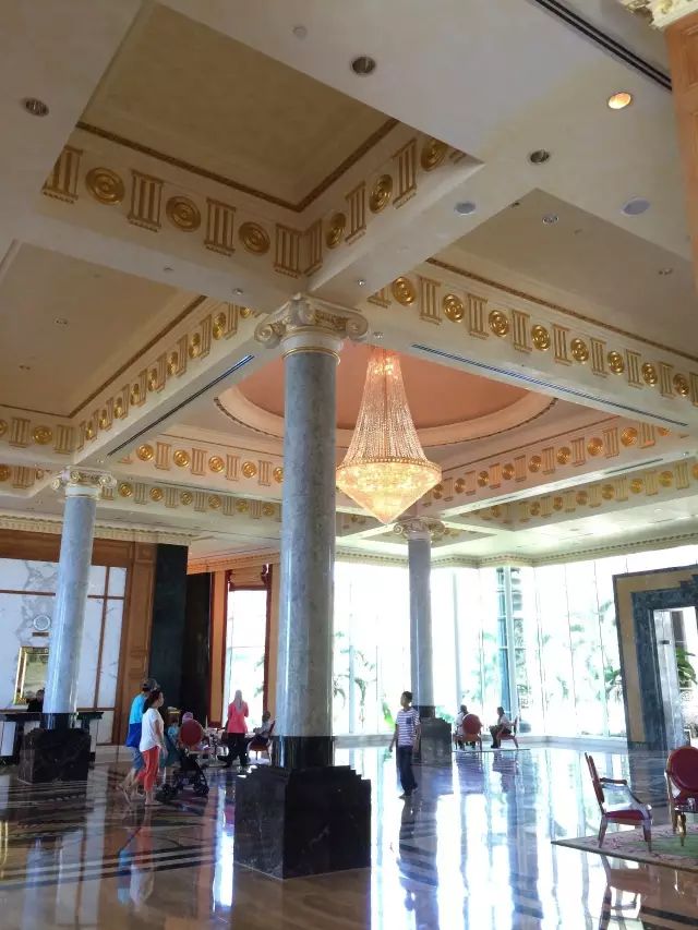 这就是传说中的帝国酒店The Empire Hotel,你所能看到的黄色都是黄金。超六星级的帝国酒店,沿海岸建在一片金色的沙滩上。原为文莱四王爷的行宫,后改作酒店,共耗资10亿美元。装修极尽豪华,随处是金光,墙壁、梁柱、天花板全是24K黄金打造,就连大堂的座椅和茶几都是镏金的,酒店大堂的装饰品和工艺品每件都价值连城,陈列在大堂中间一尊水晶骆驼,价值200万美元,是世界仅有4件中的1件。